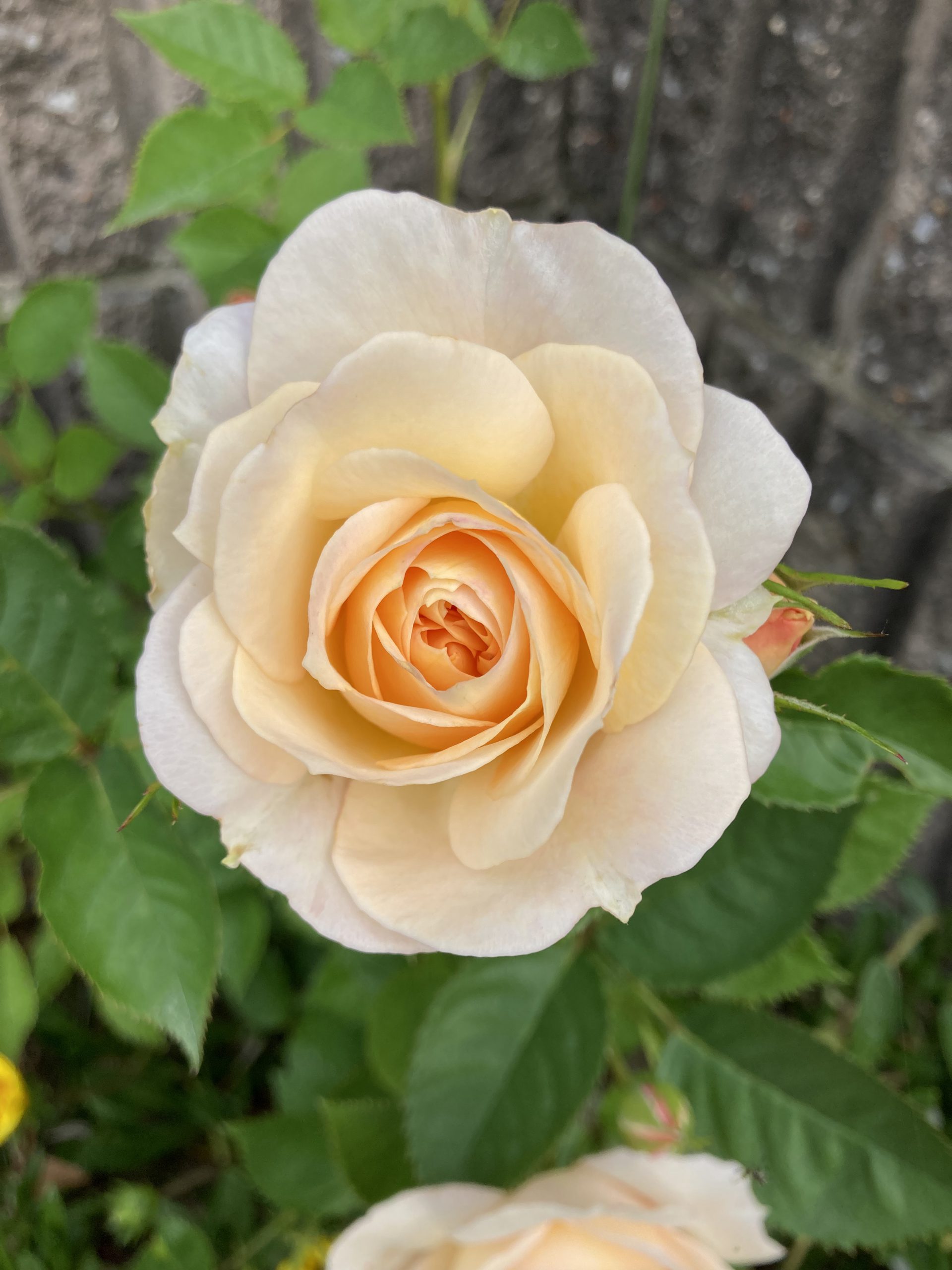 幾重にも重なる花弁と中心にピンクがかる特徴のつるバラです。