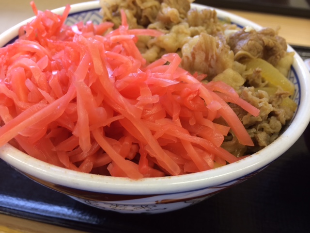 ①牛丼を頼みます。「つゆだく」又は「つゆだくだく」で注文。紅しょうがは3分の1程度。