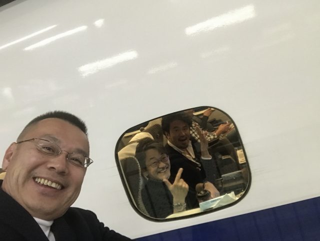 新幹線の中の藤村先生と短パン社長を見送るボク