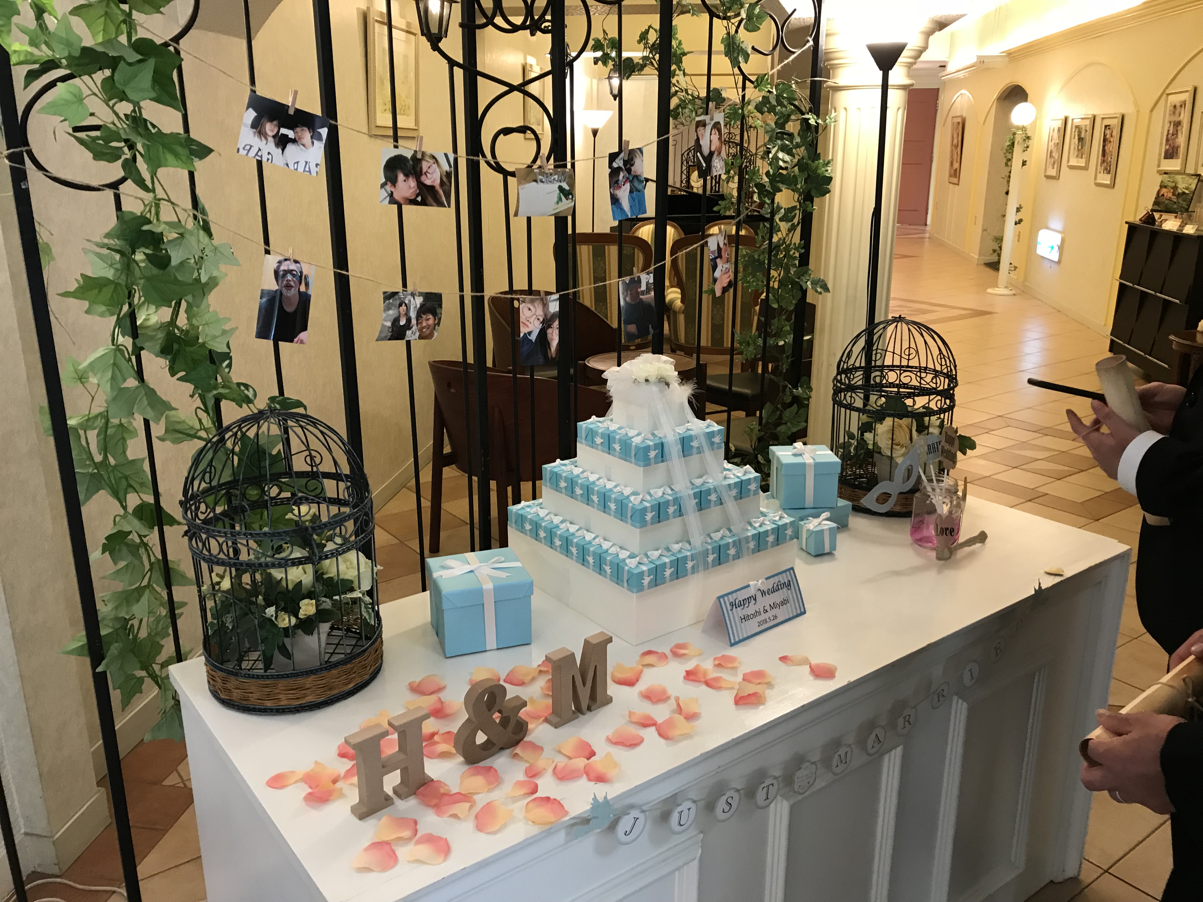自分たちのイニシャルオブジェの周りに造花の花びらを散りばめて青色の箱はティファニー風を目指して作ったら意外にも上手に出来たので良かったです。