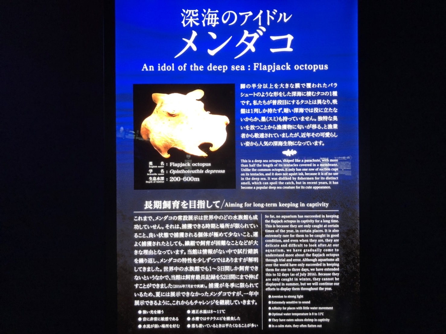 この日は深海のアイドルと言われるメンダコが展示されておらず、パネルのみ。